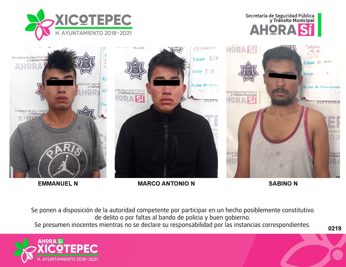 Como resultado de una denuncia ciudadana y el seguimiento oportuno de elementos de la Secretaría de Seguridad Pública y Tránsito Municipal, se logró la detención de Emmanuel N de 22 años de edad, Marco Antonio N de 21 años de edad y Sabino N de 32 años de edad, presuntos responsables de robo a transeúnte.